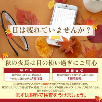 秋は、読書やスマートフォンの長時間の使用で目の疲れを感じる方が多くなります。